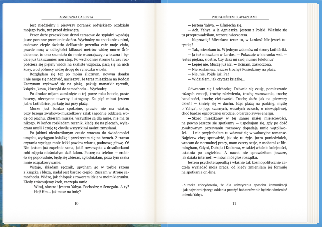 „Pod słońcem i gwiazdami” to nie romans w klasycznym sensie, ale raczej emocjonalny pamiętnik, zapis podróży, trochę przewodnik i w końcu opowieść o miłości. To również historia spotkania, które staje się katalizatorem przemiany. Agnieszka Callista używa plastycznego języka, a jej opisy Rodos niemal pachną tymiankiem i solą morską. Autorka kładzie duży nacisk na szczegóły i codzienność, ale pod tym słońcem pulsują tematy dużo poważniejsze: migracja, samotność, uprzedzenia i emocje we wszystkich barwach. To opowieść o bliskości mimo różnic, o odwadze w przekraczaniu granic i o tym, że prawdziwa miłość jest możliwa bez względu na różnice. Relacja bohaterów staje się soczewką, przez którą czytelnik widzi, jak różne kultury mogą się spotkać w jednym punkcie.