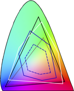 - czarny przerywany kontur – przestrzeń sRGB, zbliżona do gamy większości popularnych monitorów, będąca de facto standardem grafiki internetowej;